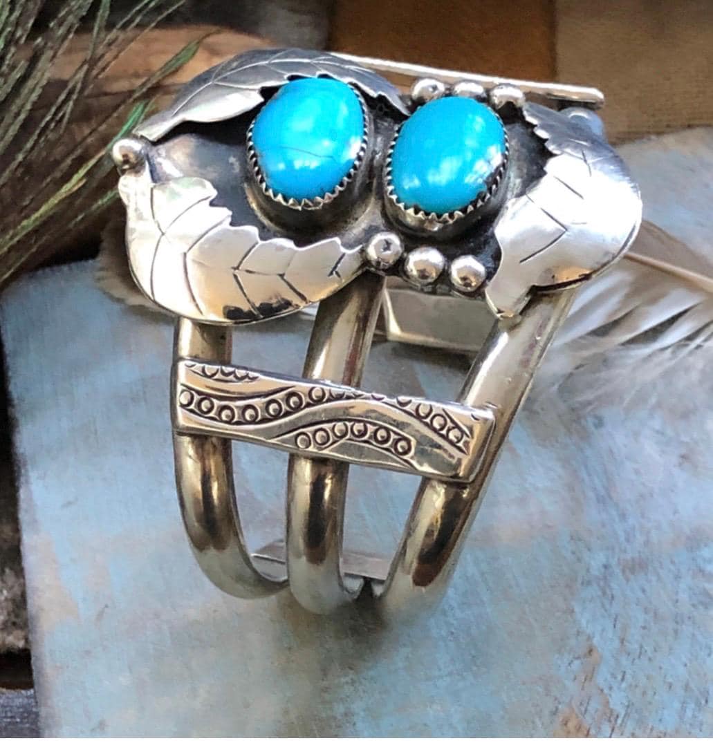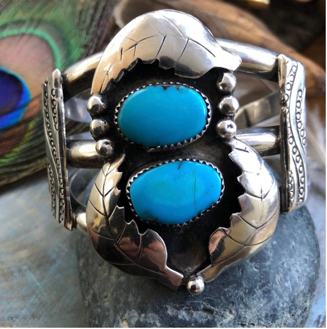 This beautiful cuff dates back to the late 40’s it is a solid well made piece two genuine sleeping beauty turquoise cabochon stones one almost looks like a heart in the center there is a hairline fracture in one stone price reflects this but is secure in setting