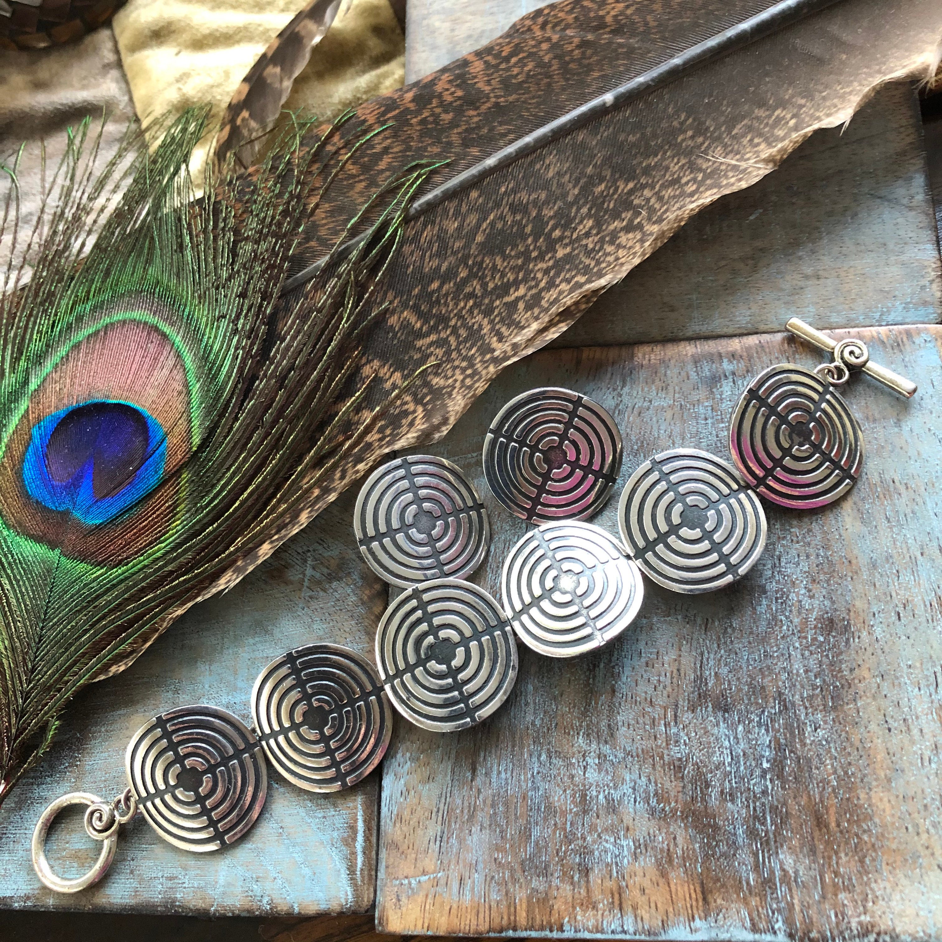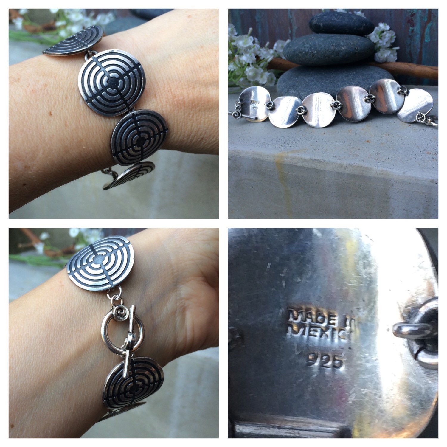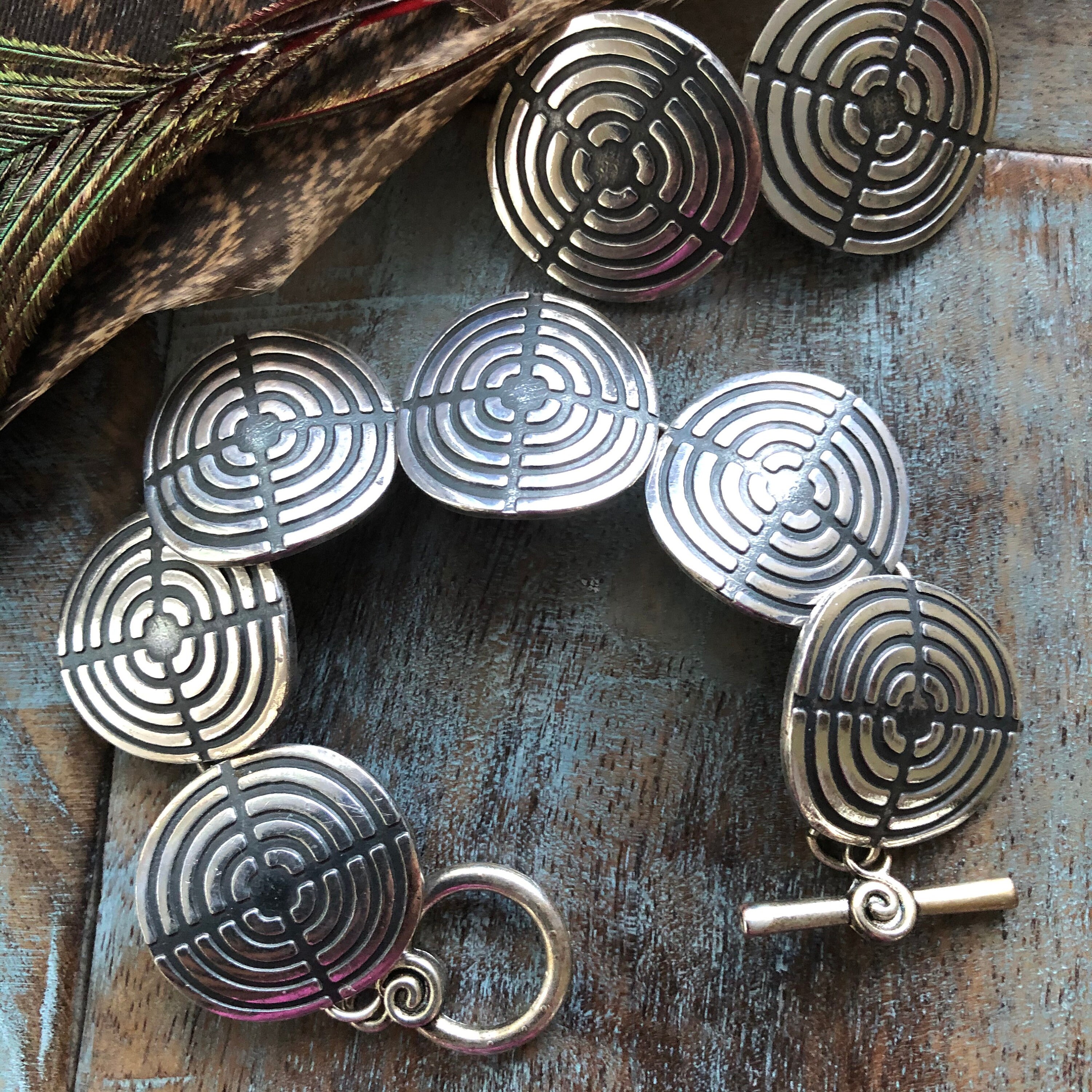 Bracelet measures 7" long and 1" wide fastens with a toggle clasp