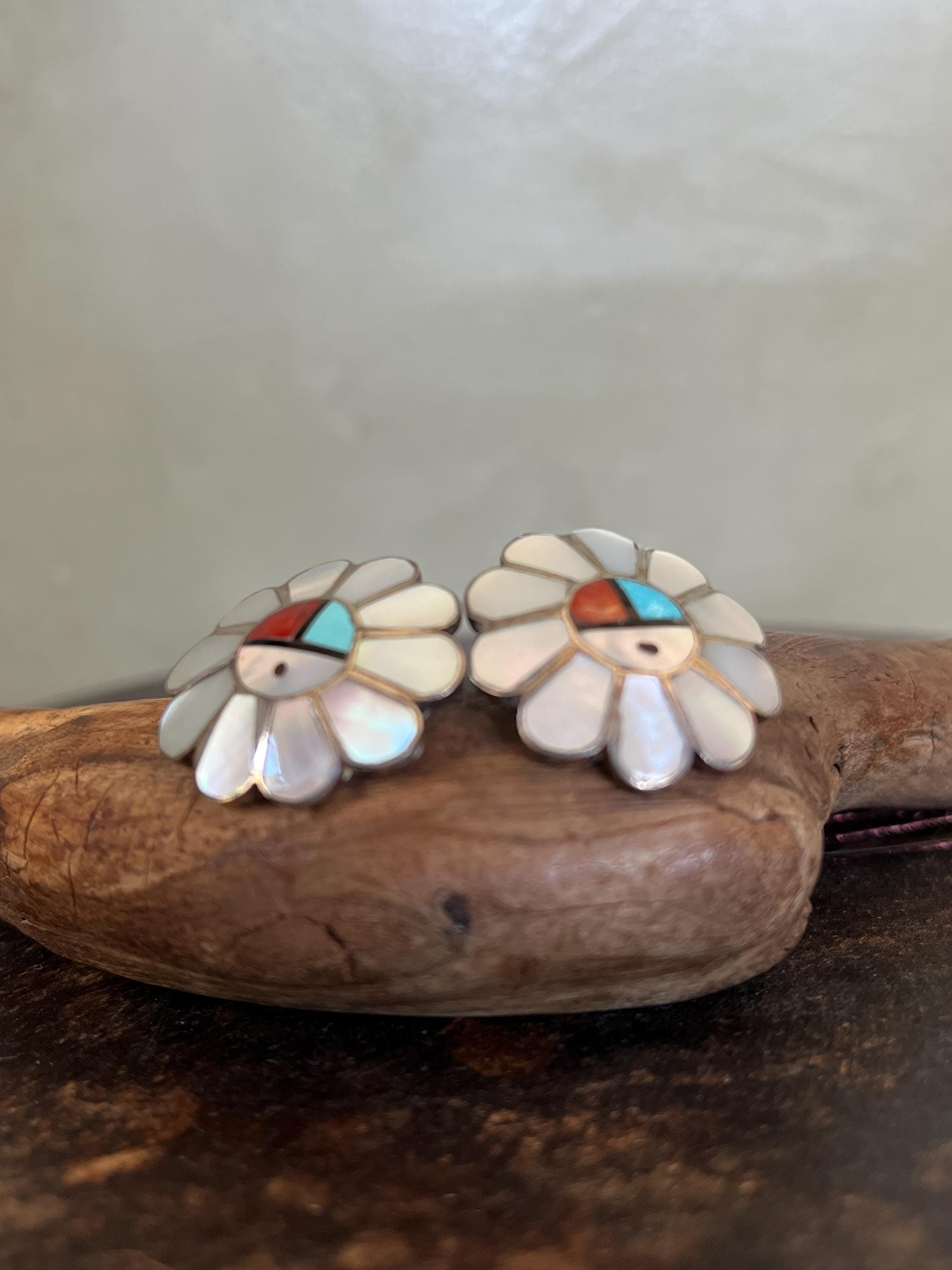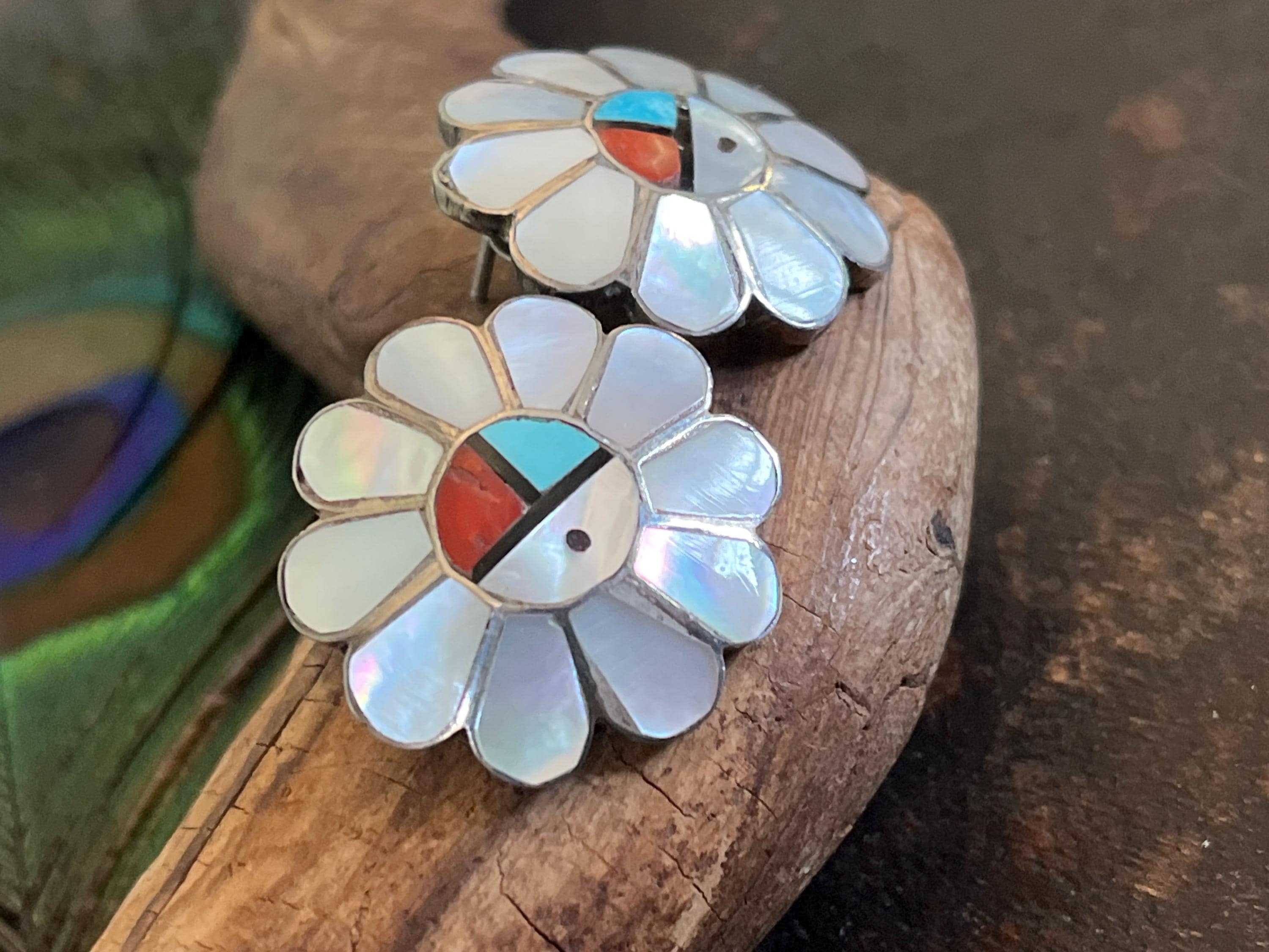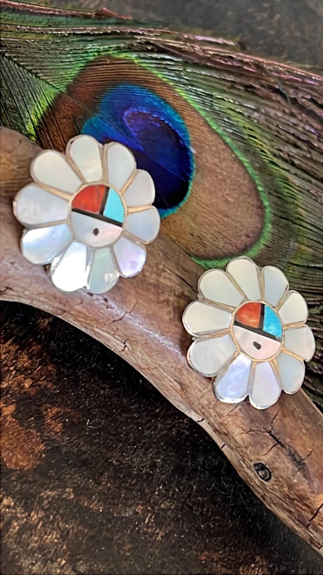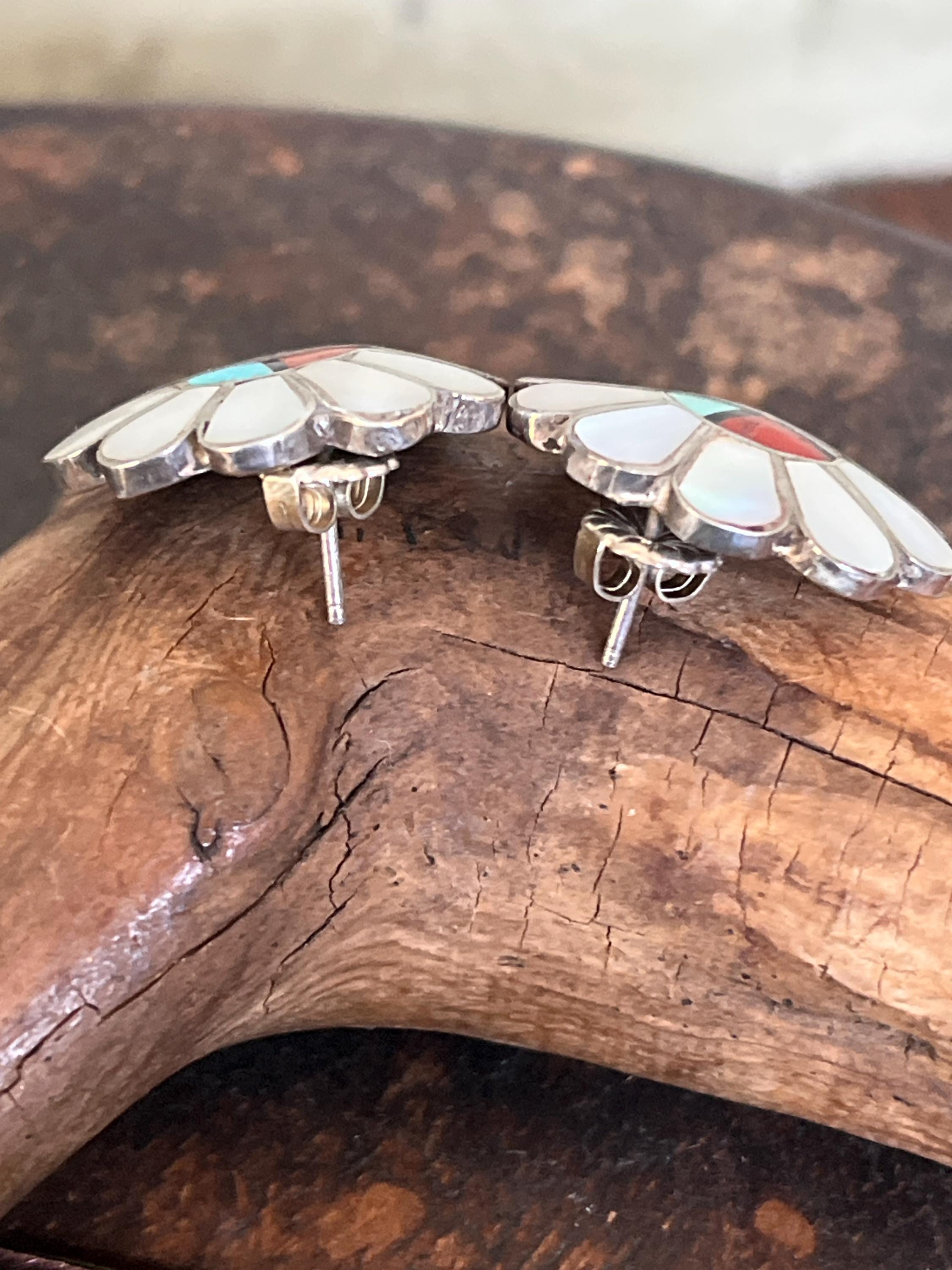 These gorgeous earrings are 7/8” in diameter Sterling silver Mother of pearl Turquoise coral and onyx inlay Post backs Vintage Great conditionzuniweigh 7.9 grams together
