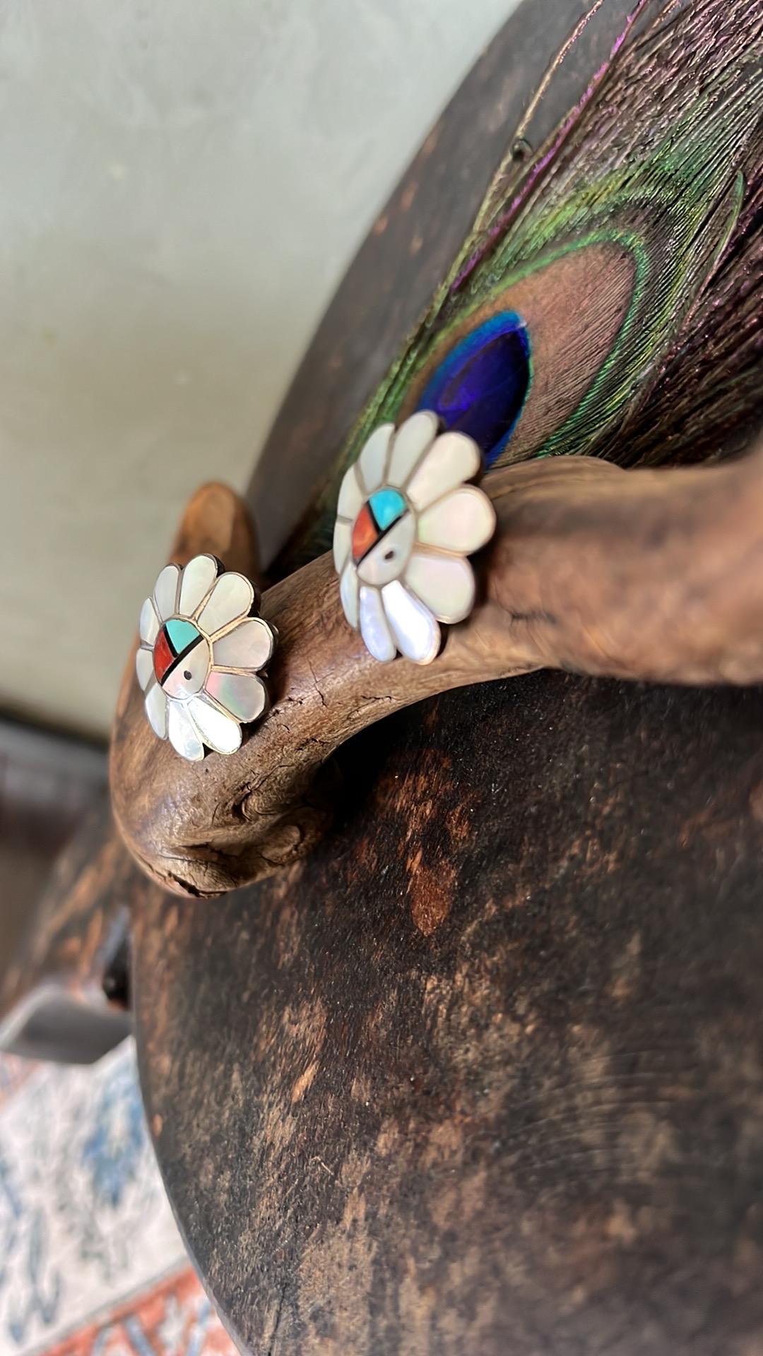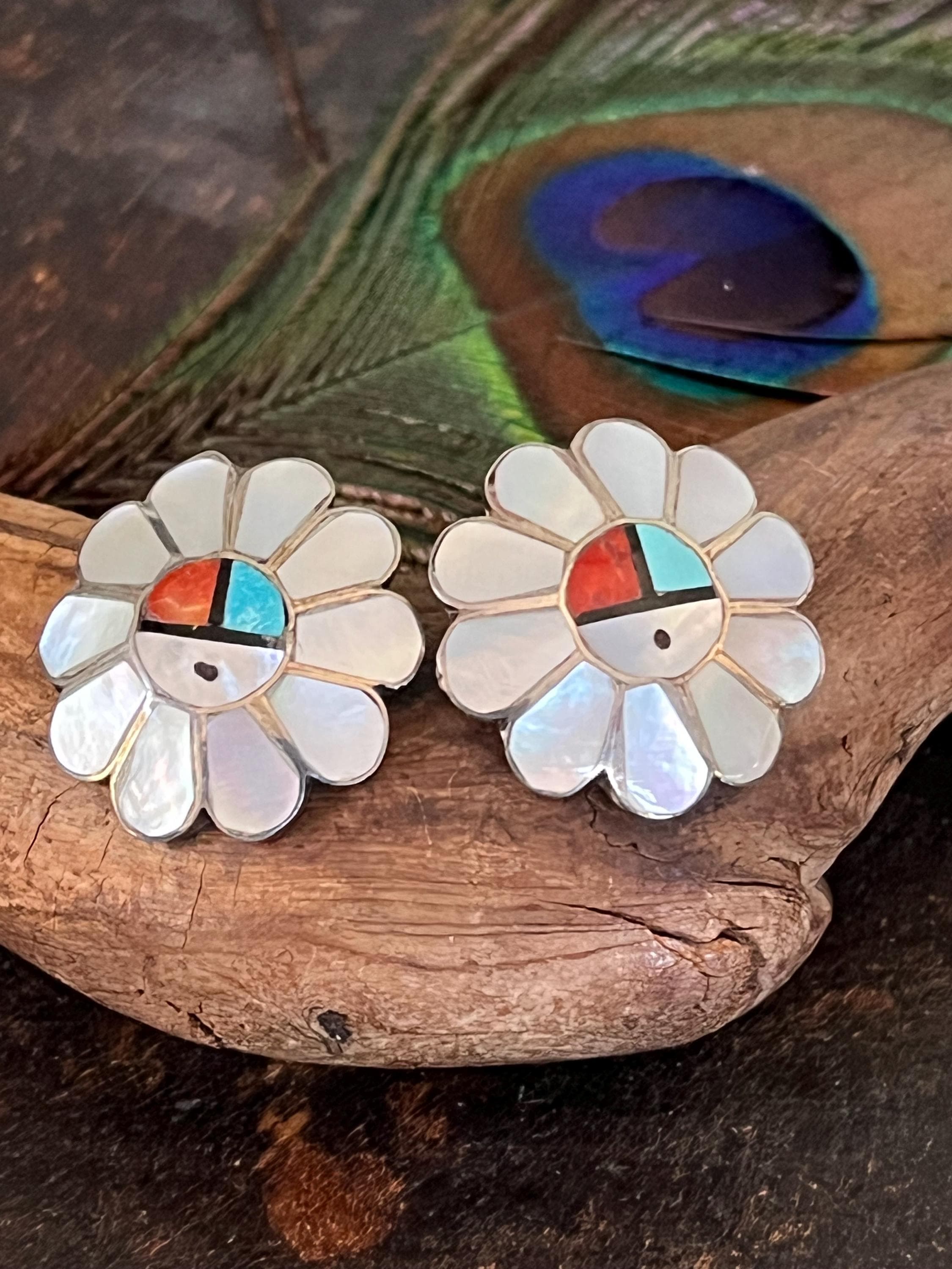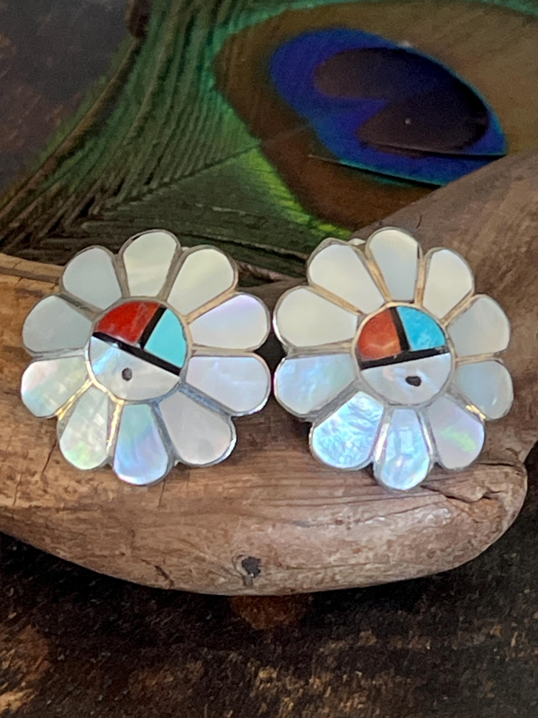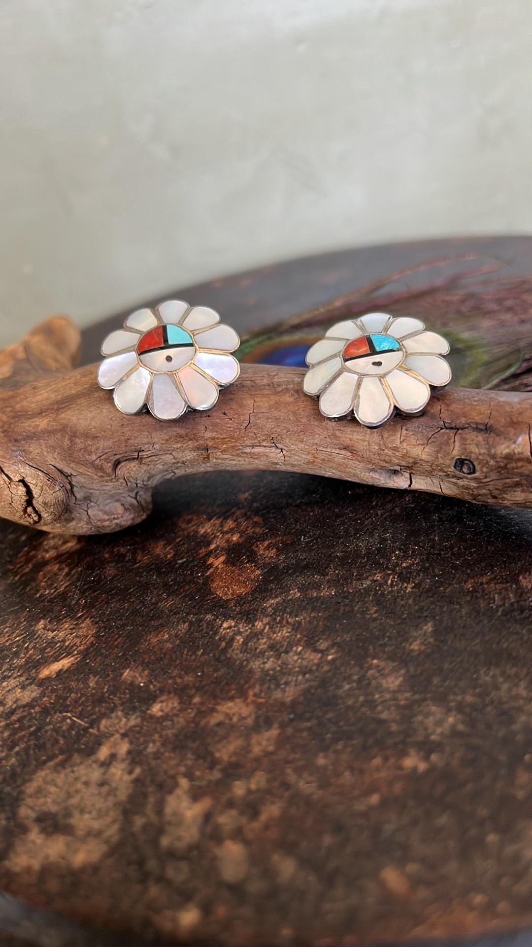These gorgeous earrings are 7/8” in diameter Sterling silver Mother of pearl Turquoise coral and onyx inlay Post backs Vintage Great conditionzuniweigh 7.9 grams together
